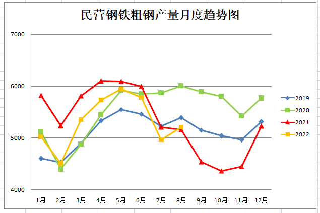 民營鋼鐵粗鋼產(chǎn)量月度趨勢圖