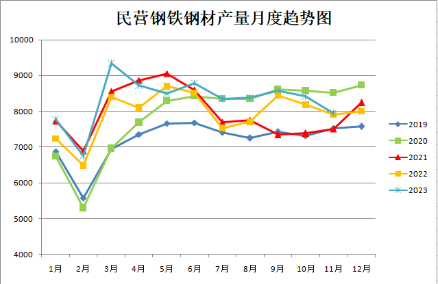 民營鋼鐵鋼材產(chǎn)量月度趨勢圖
